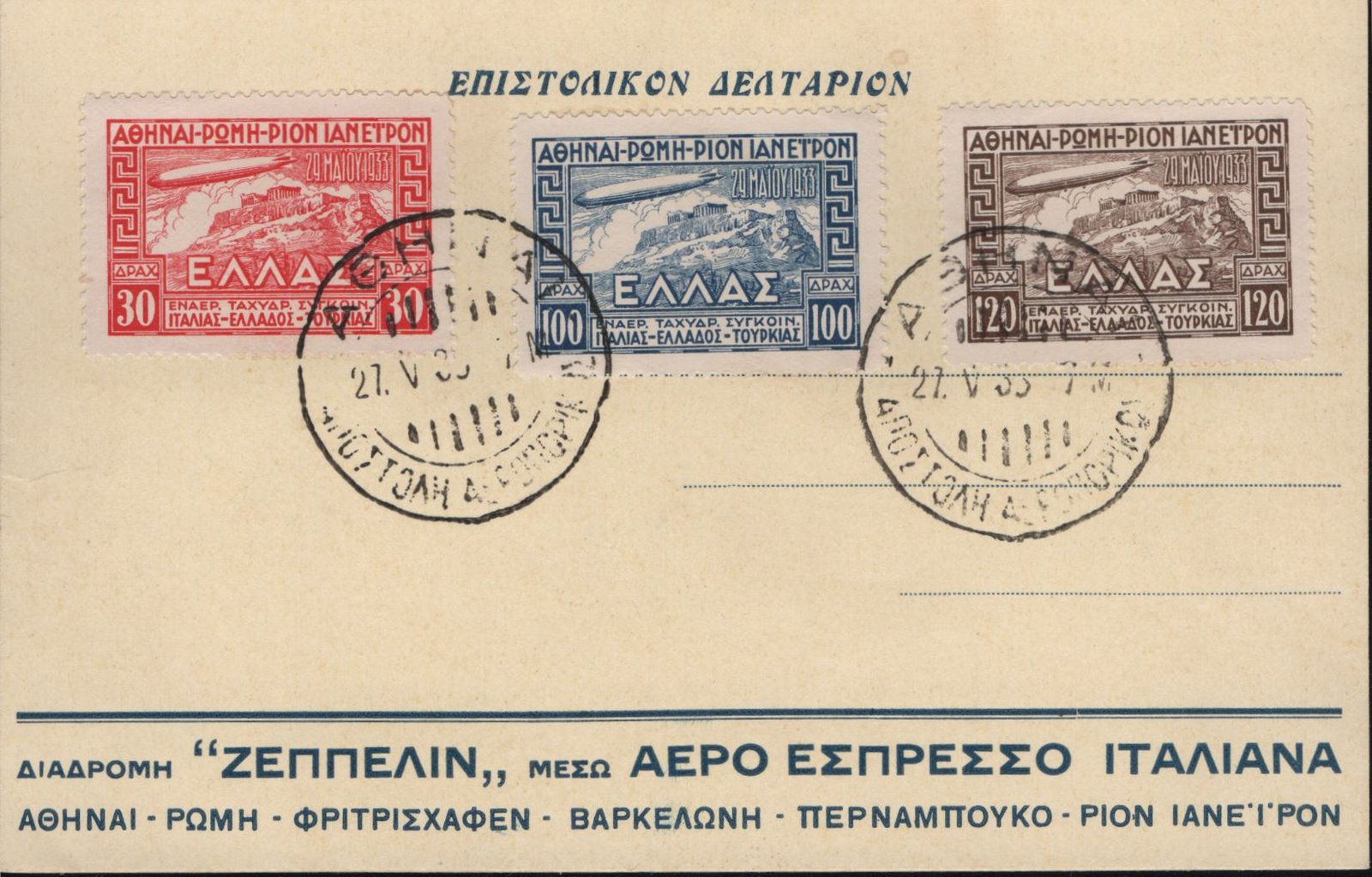 Greece 1933 Complete set of zeppelins, C5-C7 on Zeppelin Aero Express Italy Postal Card tied by last day cancels. Un-flown but unusual.