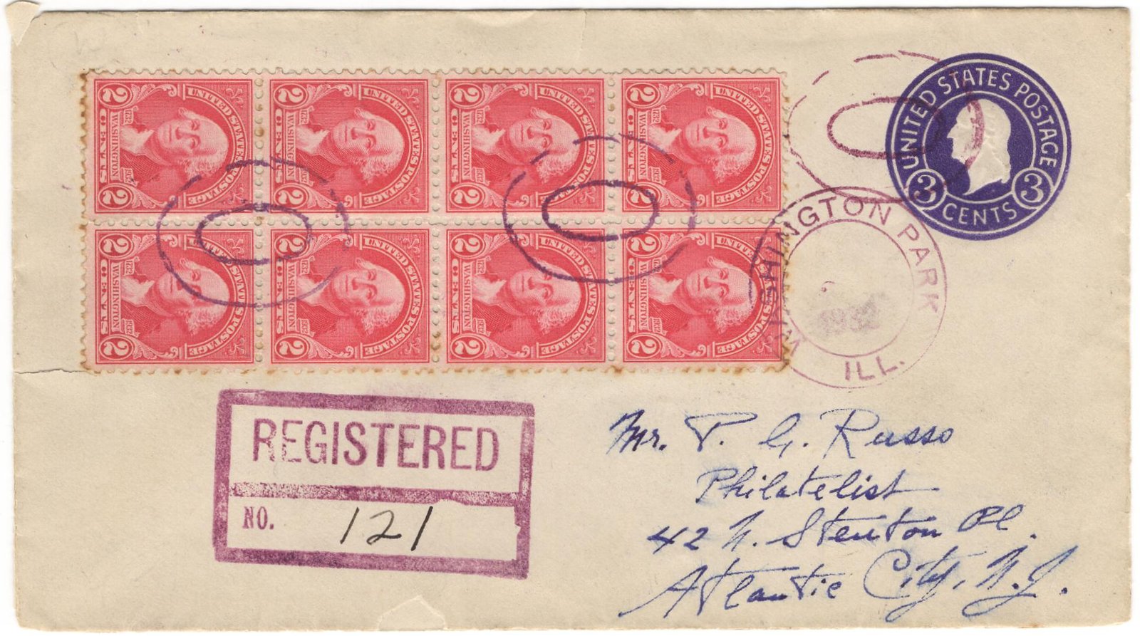 US Washington Park, IL 1933 (Sep 22) Registered cover with 707 (x8) on postal stationery tied by three N-799 Fancy cancel, 2 Concentric Circles in purple.
