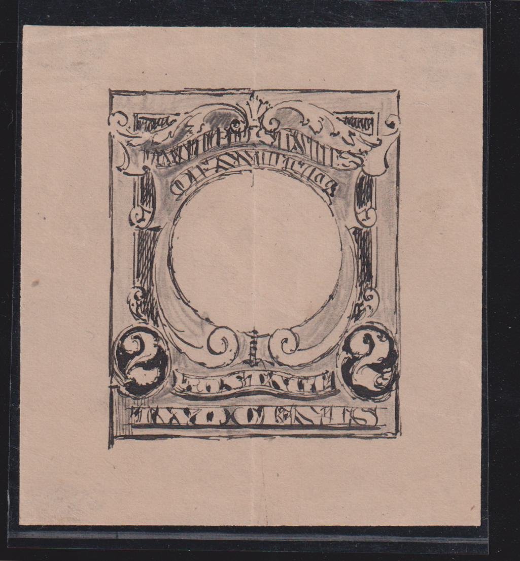 US Essays and Proofs #301E1A NH Mint XF Unique pen and ink drawing 77x82mm, Folded vert with 1/2 ink tracing of frame on reverse Cat Value: $2000+