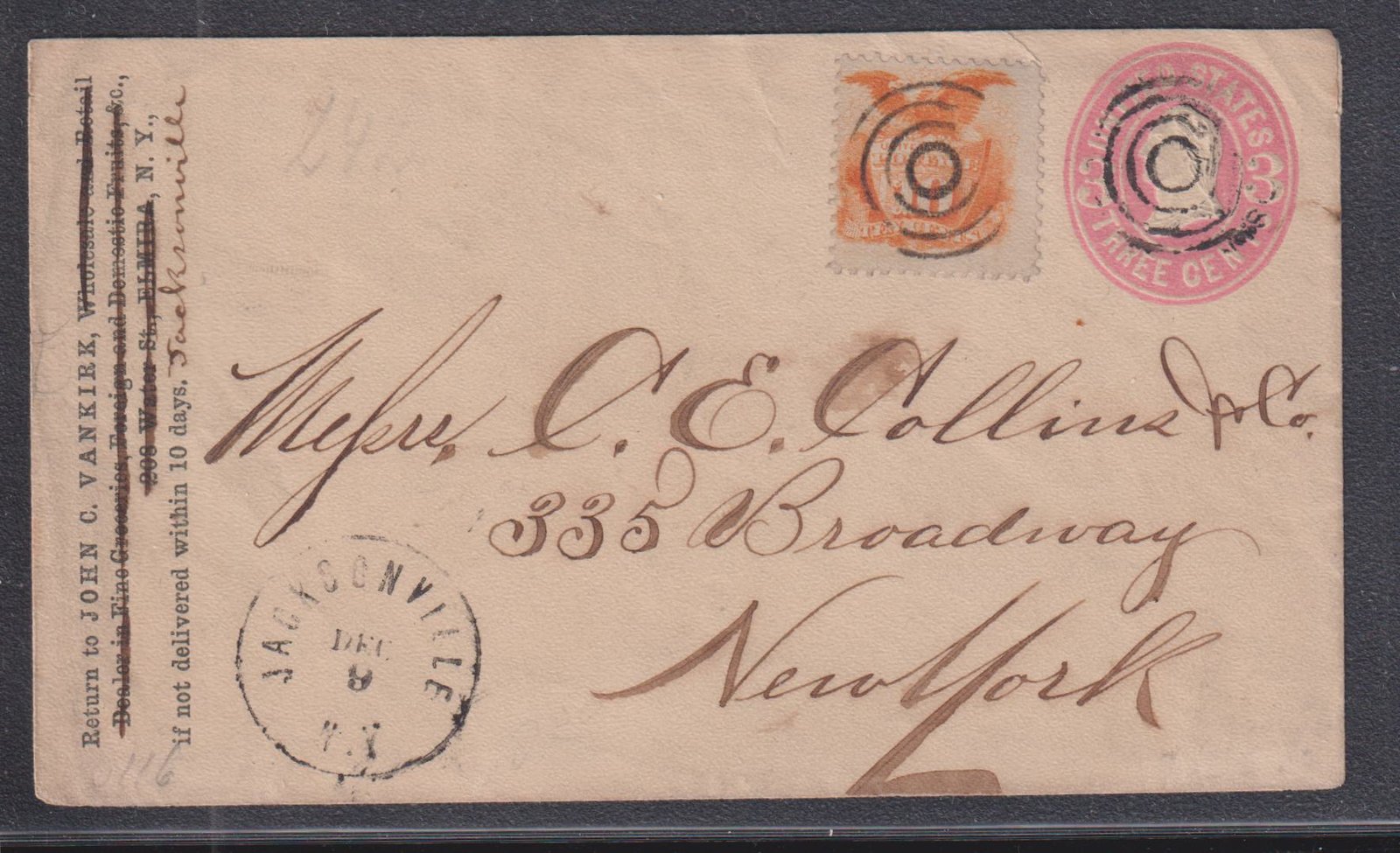 US 1869 Pictorials #116&U58 F – VF Target cancels on stamp and envelope Jacksonville FL to NY NY Cat Value: $375