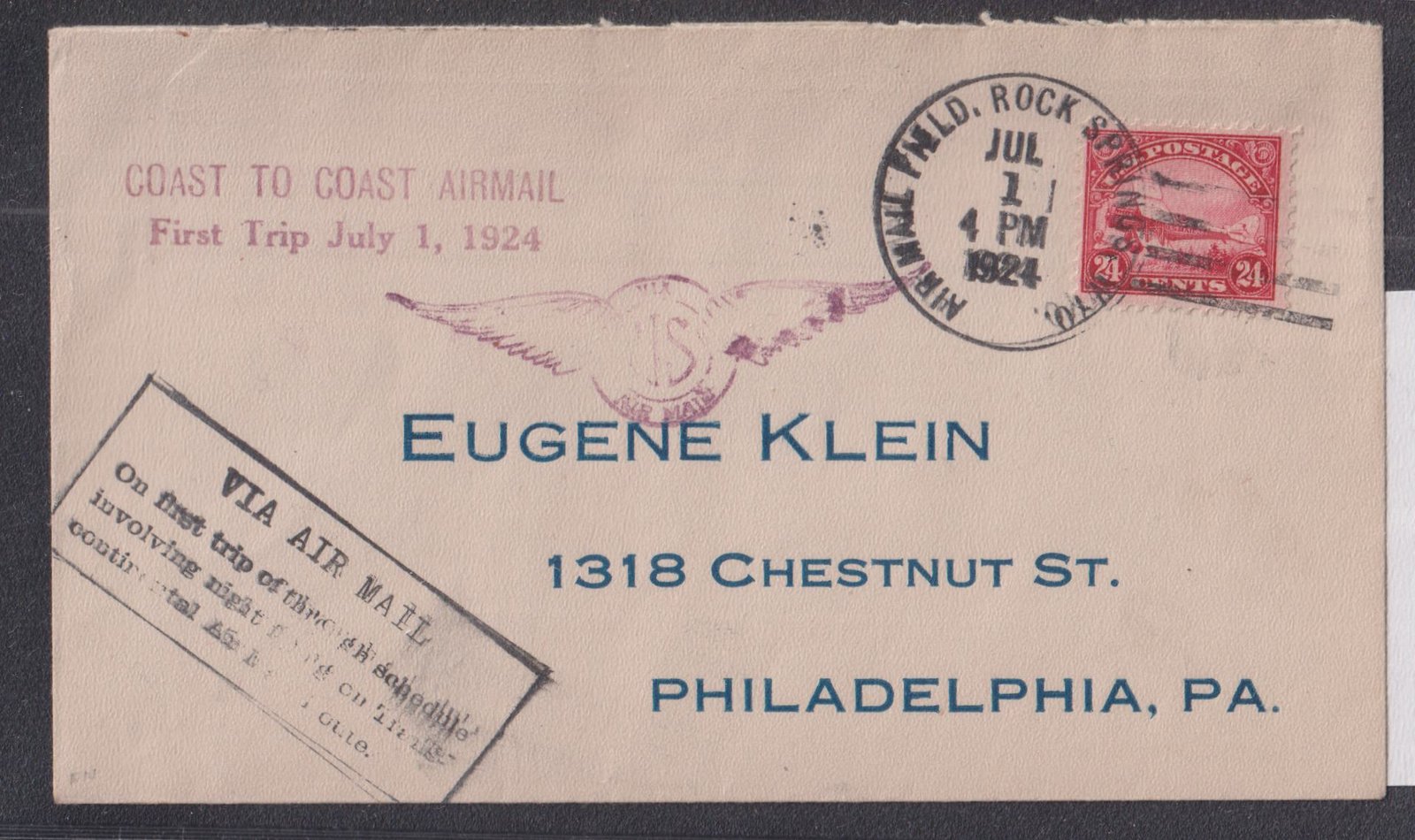 US Airmails #C6 VF Rock springs WY 7/1/24 to Philadelphia Cat Value: $80