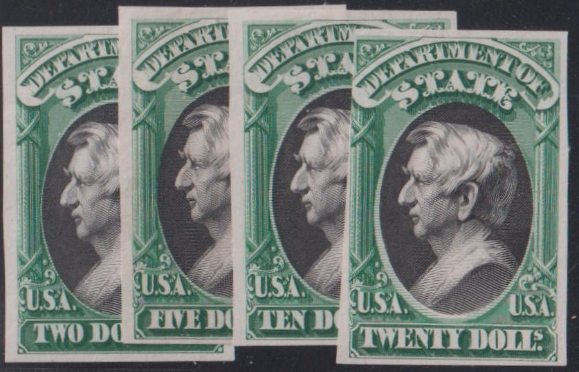 US Essays and Proofs #O68-17P3 NH Mint F – VF India pains   No gum as issued oh 68-9 VF , 70 thin, 71 fine Cat Value: $400