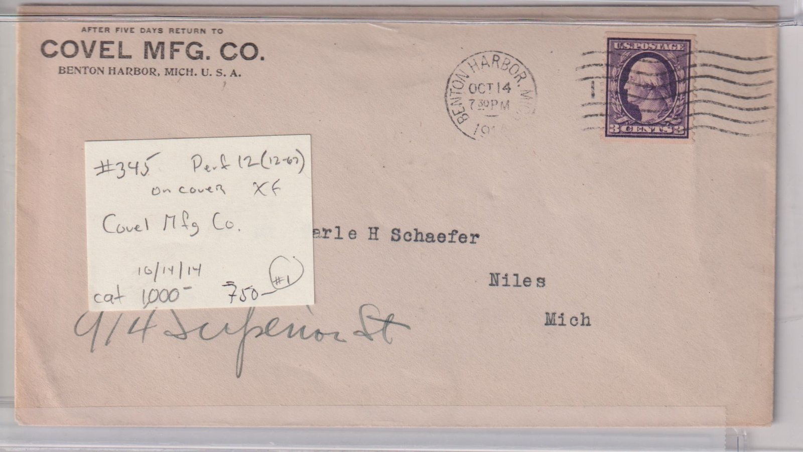 US Washington – Franklin #345 XF Perf 12 on cover Covel Mfg Co. 10/14/14 Cat Value: $1000