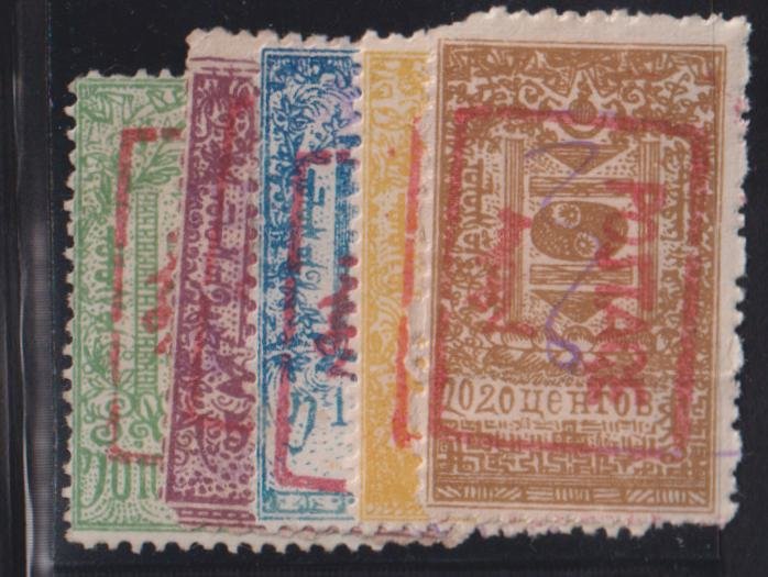 Mongolia #16b-20b Mint Used F – VF red ovpts 176 mint few perf flows as usual Rare