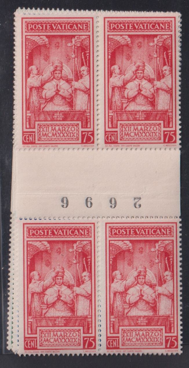 Vatican Sets and Singles #68-71 NH F – VF Gutter Block of 4 with control # at gutter Cat Value: $192