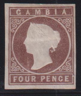 British Area A- M – Gambia #3 Hinged Mint VF great appearance – small flts trivial thinning emb reinforce Cat Value: $400