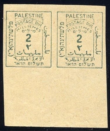 Palestine Stamp, Scott J2 VAR. NH VF Margin Imperf Pair w/ gum cv 550.00