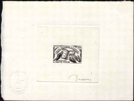 Burkina Faso 1967 Artist Die Proof. Scott 179. 30f, Signed proof in black showing National Savings Bank book with hands and coins.