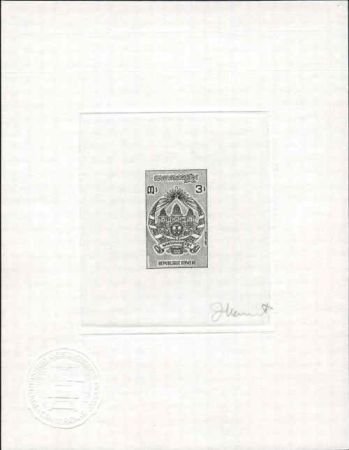 Cambodia 1971 Artist Die Proof. Scott 264. 3r Republic – Khmer Coat of arms. proof in charcoal gray, signed. (Only 14 Exist)