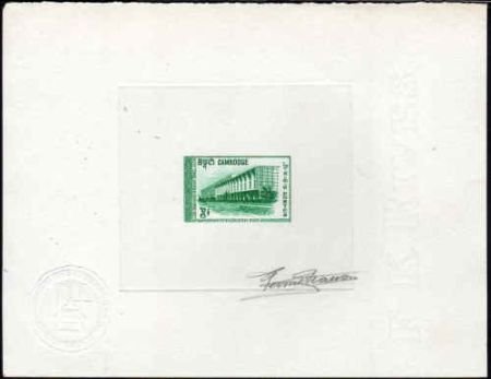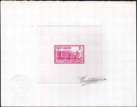 Cambodia 1968 Artist Die Proof. Scott 188-190. Set of three signed artist proofs; 4r in blue, 6r in green and and 9f in pink. Schools and Universities.