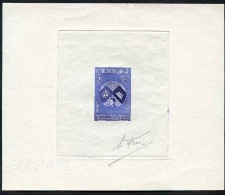 Cambodia 1957 Artist Die Proof, Scott 59, Signed proof in blue, Prince Sihanouk, globe and flags.