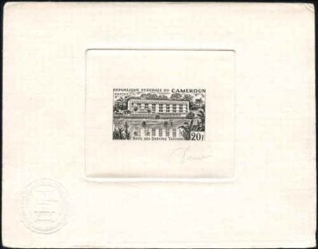 Cameroun 1966 Artist Die Proof, Scott 433, 20F, Signed artist proof in black, Hotel of the Deputies, Palm Trees.