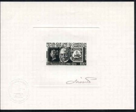 Cameroun 1979 Artist Die Proof : Scott C280, 100fr black signed proof. Sir Rowland Hill, Penny Black, Stamp on stamp