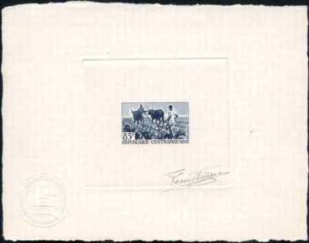 Central Africa 1965 Artist Die Proof: Scott 43, 85fr, Signed proof in blue, Farming, Cattle.