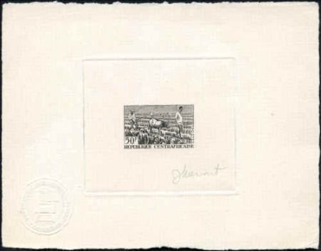 Artist Die Proof : Central Africa 1965 Scott 42 Signed proof in black 50fr. Ox, Farming, Animals.