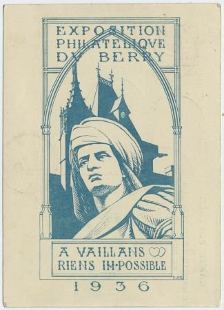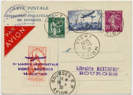 France 1936 (June 15) First Flight card Vichy – Bourges, Philatelic Exhibition of Berry illustrated card with vignette. Bourges receiving cancel on address side.