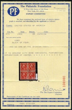 US 579 F- VF Used Block. PFC Mentions a Few Horizontal Perforation Separations At Center. CV $1,750