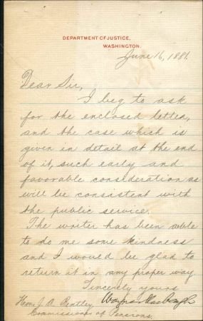 Early Autographs Wayne MacVeagh 1881 Attorney General signed letter on Dept. of Justice letterhead, slight water stain. Includes portrait engraving