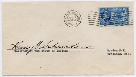 US 1950 Indiana Territory issue, Scott 996 signed by Indiana Governor Henry F. Schricker 1949-1953. Cover dated 8/11/51 and uncacheted.