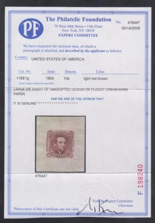 US 116E1g Essay XF 10 cent Lincoln unadopted design for 1869 pictorials – PFC