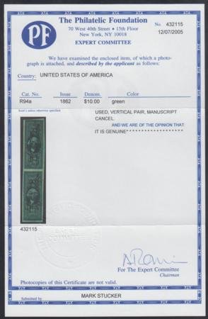 US R94a Revenue Used Vertical pair – Top F – VF, bottom XF, PF Cert cv $350