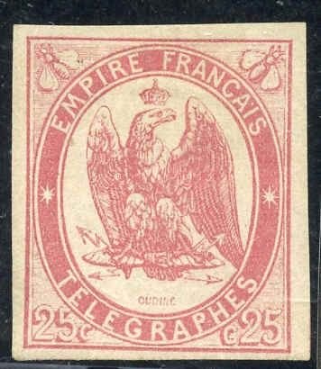 France 1868 Telegraph Yv 1 VF – XF H 25 c carmine Fresh OG with large margins. (cv €750.00=$1,050)