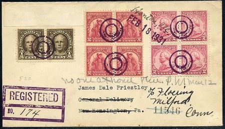 US Henton Illinois 1931 (Mar 9) with Scott 657 and 689 both in blocks of four. Circular doughnut fancy cancel.