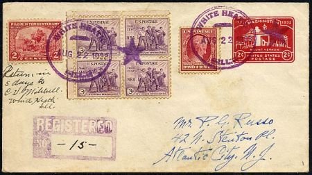 US White Heath, Illinois 1933 (Aug 22) registered postal stationery cover with Scott 549, 732 block and U525. Two strikes of Circular White Heath cancel 1234 and two strikes of solid star fancy cancel, 1236, both in purple.