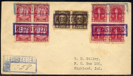 US Worth, Illinois 1930 (Aug 12) registered cover with Scott 551 pair, 683 pair and 688 block. Five strikes of “Registered” in rectangle in blue. Sent to and from W. H. Gilley. Some toning around stamps.
