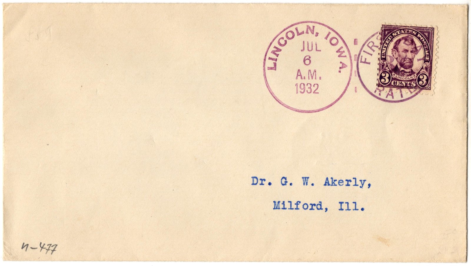 US Iowa, Lincoln 1932 (Jul 6) CoverĀ with 635 tied by single strike of “First 3c Rate” Fancy Cancel in purple.