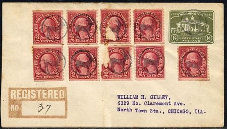 US Antelope, Montana 1932 (Aug 20) registered cover with Scott 599 (x9) and U532. Each stamp with a strike of Antelope fancy cancel in black. Two stamps are damaged with face scrapes. Cover addressed to W. H. Gilley.
