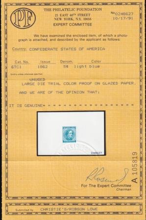 US 1862 Confederates & Possessions 5-ct light blue Die Proof On 93mm x 61mm Glazed Card. Pristine & Fresh, Scott Lists + Prices Other Varieties But Not This One. CSA Cat # 6DPa CV $2500 With 1991 PF Cert. Calling It 6TC1 Which Is No Longer Listed