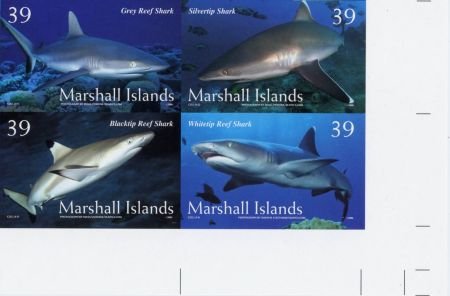 Marshall Is. 883 imperf block of 4 from the press sheet, reef sharks, fish. All photos for reference only. All purchases will have a margin. If you require a specific position, please let us know.