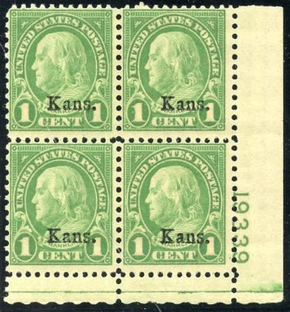US 658 Fine NH Kansas Overprint Plate Block 19339 LR cv $90
