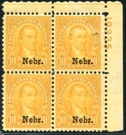 US 679 VF H Nebraska Overprint Plate Block 19235 UR cv $925