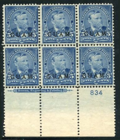 US Possessions – Guam 5 VF NH Plate Block of 6 – Exceptional Quality + Fresh! cv $1555