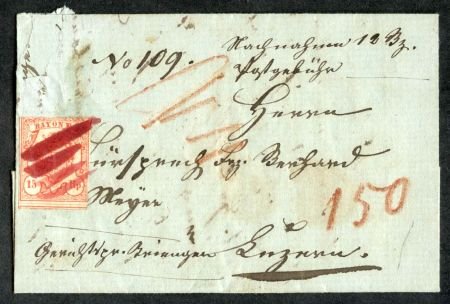 Switzerland 1852 Rayons on Cover Sc 11 Zum 18 Used Cover cut in at top, cover faults, full letter cv sc 1700.00 cv sfr 2400.00