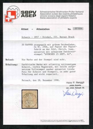 Switzerland 1858 – 1862 Scott 39 Zumstein 25Gb Used, Superb color variety orange yellow. cv sfr 100.00 with certificate.