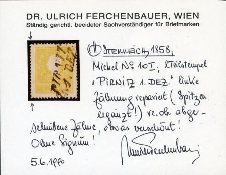 1858 Austria 6a VF – XF appearance, Used Type I, with Certificate. Pirnitz 1 Dez cancel, Michel 10I
