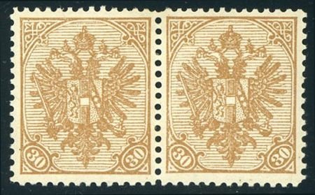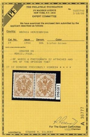 1900 Bosnia and Herzegovina 19 VF LH Pair, 30h bister brown, Philatelic Foundation certificate, Michel 18