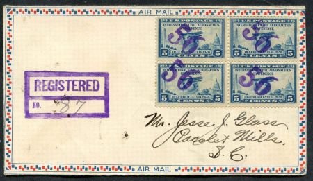 US Fifty-Six, Arkansas 1929 (Dec 4) registered airmail cover with 650 block of 4. Each stamp with strike of fancy cancel, 341, solid “56” in purple. W. H. Gilley return address on back flap.