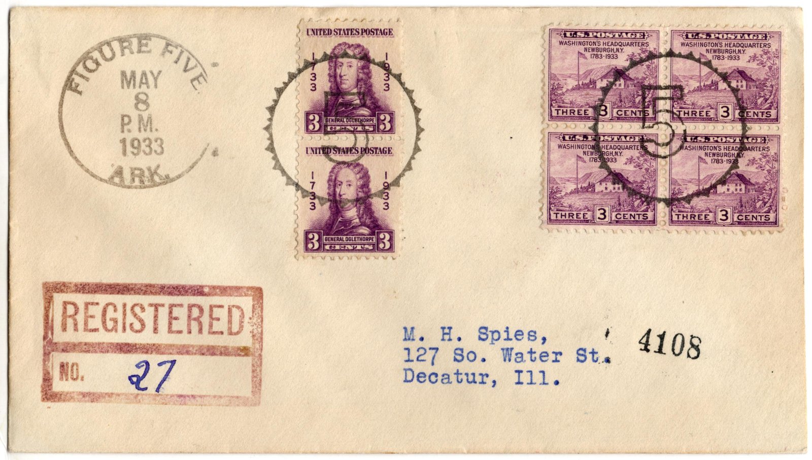 US Arkansas, Figure Five 1933 (May 8) Registered cover with two strikes of “5” in circle fancy cancel #343 in black on Scott 727 (x4) and 726 (x 2)