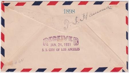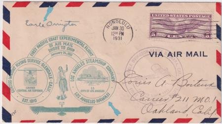 US 1931 (Jan 24) Airmail cover with C12 and Earle Ovington autograph. Experimental ship to shore flight with first airmail pilot cachet.