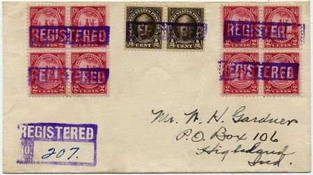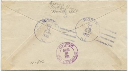 US Worth, Illinois 1930 (Jul 14) registered cover with Scott 551 pair and 683 blocks (x2) tied by five strikes of negative “registered” in box, N-846