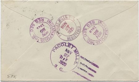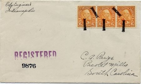 US Indianapolis, Indiana 1929 (Nov 25) registered cover to C.A. Paige with six strikes of solid “I” fancy cancel 575 in black over 638 strip of three.