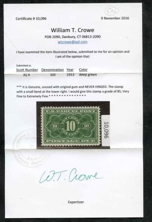US JQ4 Parcel Postage Dues NH VF XF Fresh – Crowe Cert – Insignificant Gum Bend LR cv as 85 – $450.00