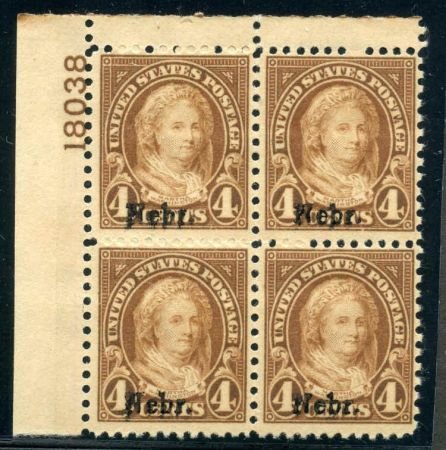 US 673 Mint F – VF LH Nebraska Overprint Plate Block 18038 UL cv $275