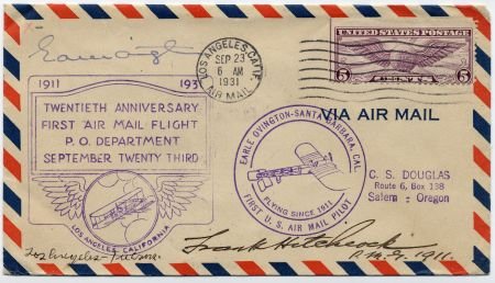 US 1931 (Sep 23) The Anniversary of the First Airmail Flight with C12 signed by the pilot, Earle Ovington, and the postmaster.