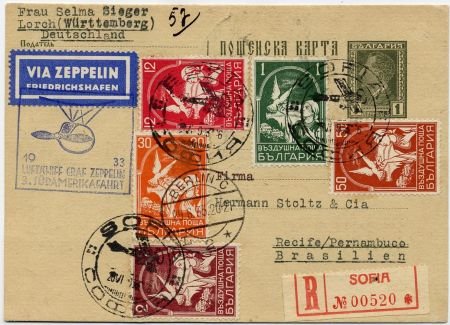 Bulgaria 1933 (Jun ) 3rd South America Flight 216 l postage on front and back including C5-11. Berlin connecting flight on 1 l postal card.