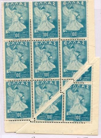 Greece 465 NH Block LR Corner Block of 9 with Spectacular Pre Printing Paper Fold